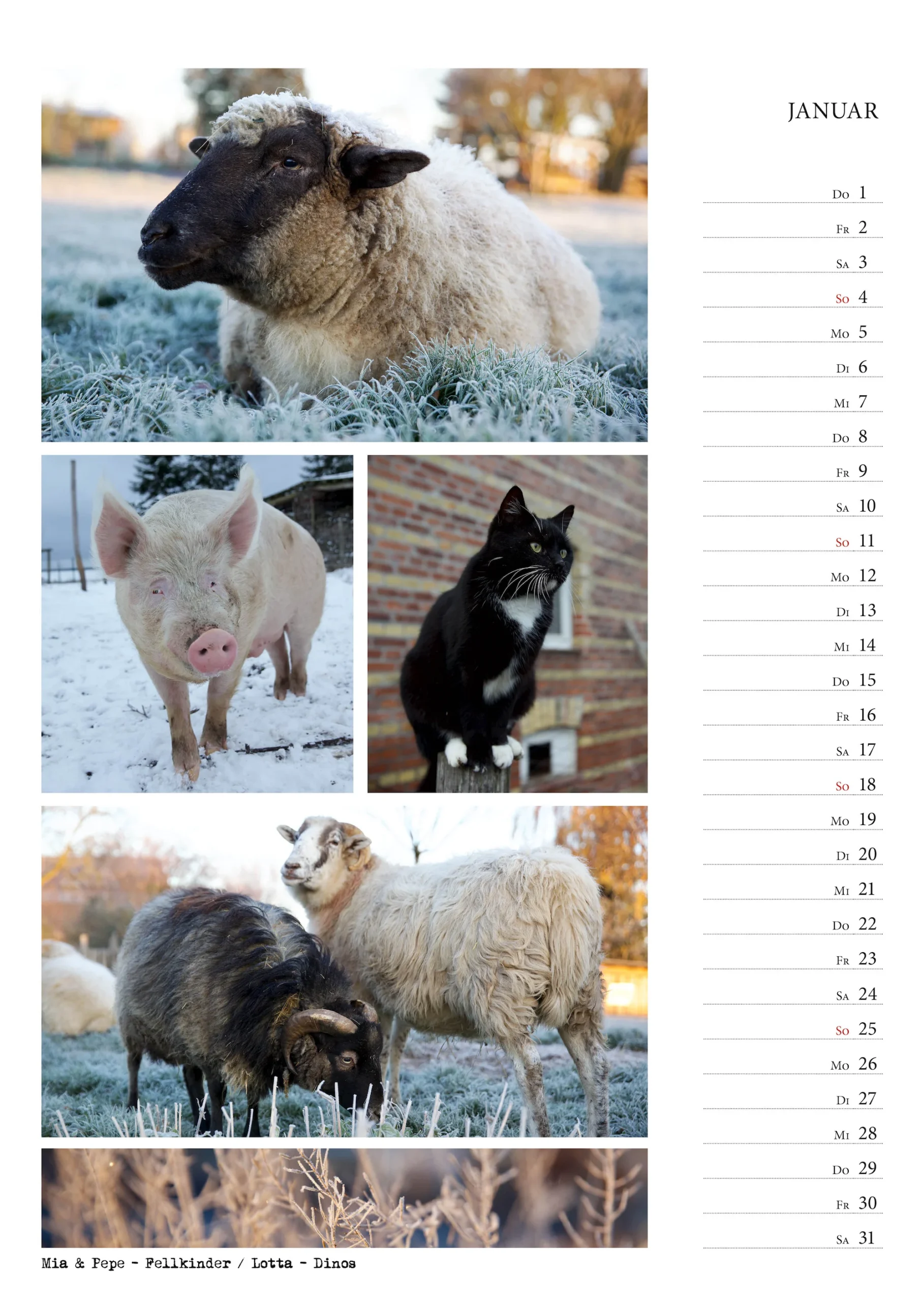 Auch im diesjährigen Kalender könnt ihr euch auf eine speziesübergreifende Auswahl unserer tierischen Kinder freuen; sprich sowohl auf Mitglieder der Federfreunde, der Wollbande, auf Bewohner des Hasenlandes, unsere Katerkumpels und Fellkinder, die Dinos – als natürlich auch unser Borstenhood.